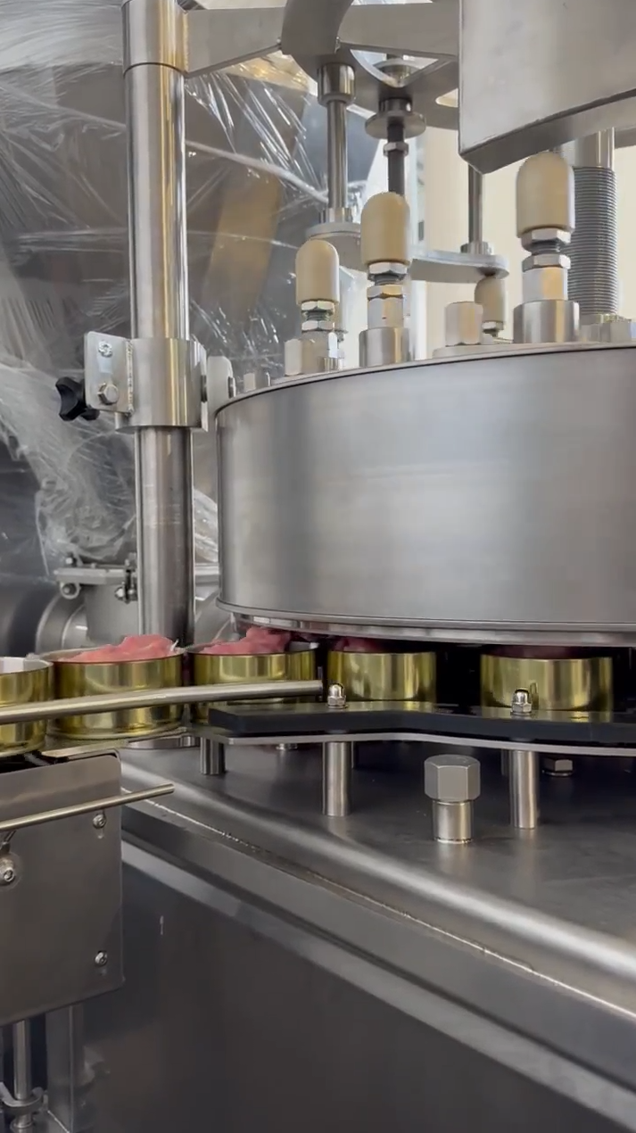 Фасовка мяса тунца в консервную тару на дозаторе-наполнителе BESTEQ-V2-FNA-M